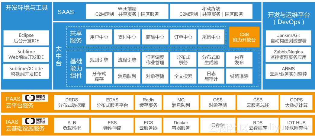 传统的云是IaaS、PaaS、Saas,阿里增加了2层,DaaS(Data as a Service,数据即服务)和BaaS(Business as a service,商业即服务)。