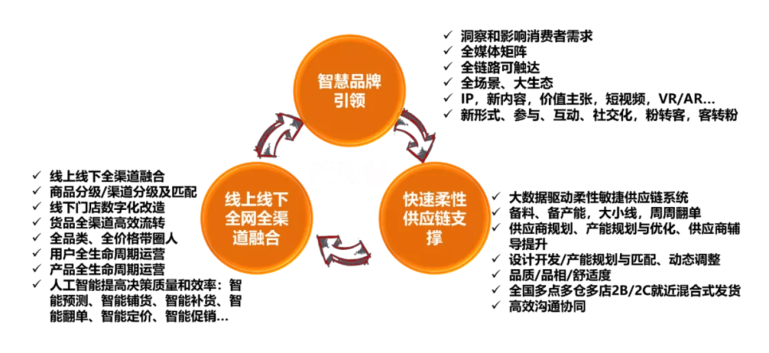 部分领先企业已经进入到上游,利用大数据驱动品牌优化、商品企划、设计开发、柔性制造、物流供应链优化、供应链金融、区块链技术全程溯源防伪仿窜等;