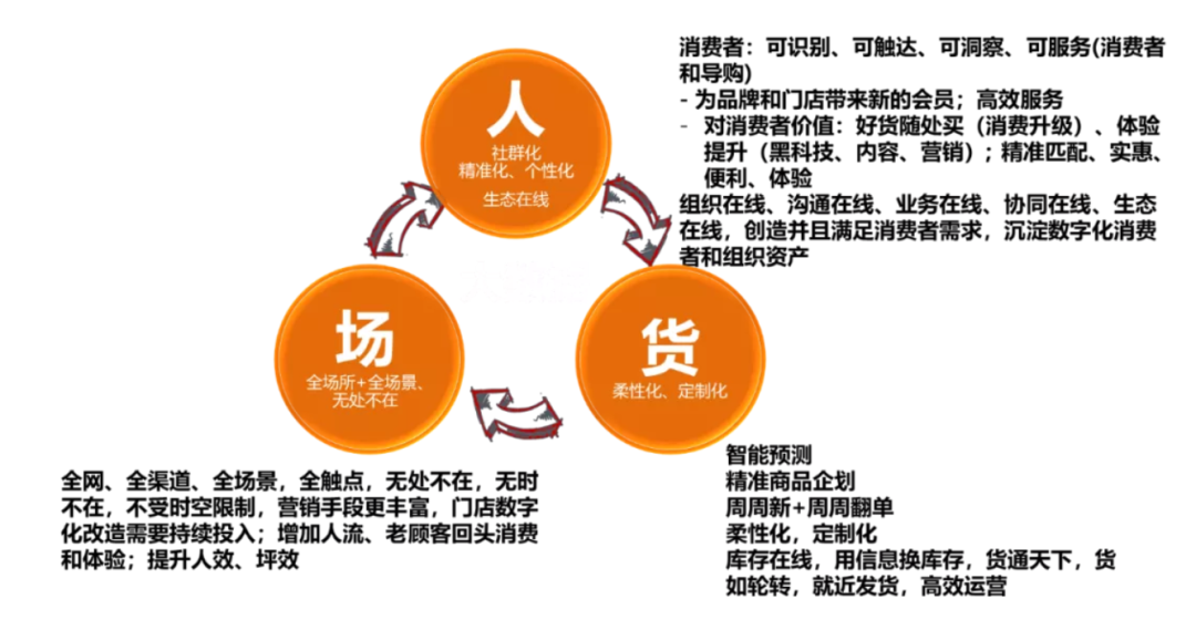 ■ 人:以前仅仅是指消费者,而这还远远不够。谁来服务消费者?导购等一线员工后面还有店长、经销商、总代理、品牌商、供应商、物流商等,这个链条上相关人员都了解消费者需求才能真正服务好消费者。